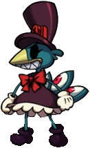 Avery (JP: エイブリー Eiburī) is a small blue-fanged bipedal peacock dressed like his "boss" Peacock, has tail feathers resembling Peacock's Argus System and pure black eyes resembling Peacock's hollow eye sockets, where her eyes had once been before she was maimed as a slave.
